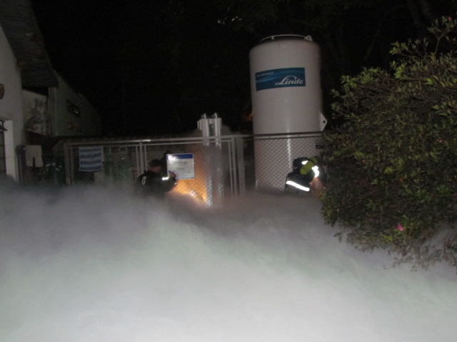 Houve ruptura de um dos encanamentos próximo ao tanque, foi isolada a área onde a névoa se formou, pois o Oxigênio em grande concentração pode formar vapores que causam tontura ou asfixia de forma inesperada, pode causar queimaduras na pele e lesões por congelamento e em caso de fogo pode produzir gases irritantes ou tóxicos.