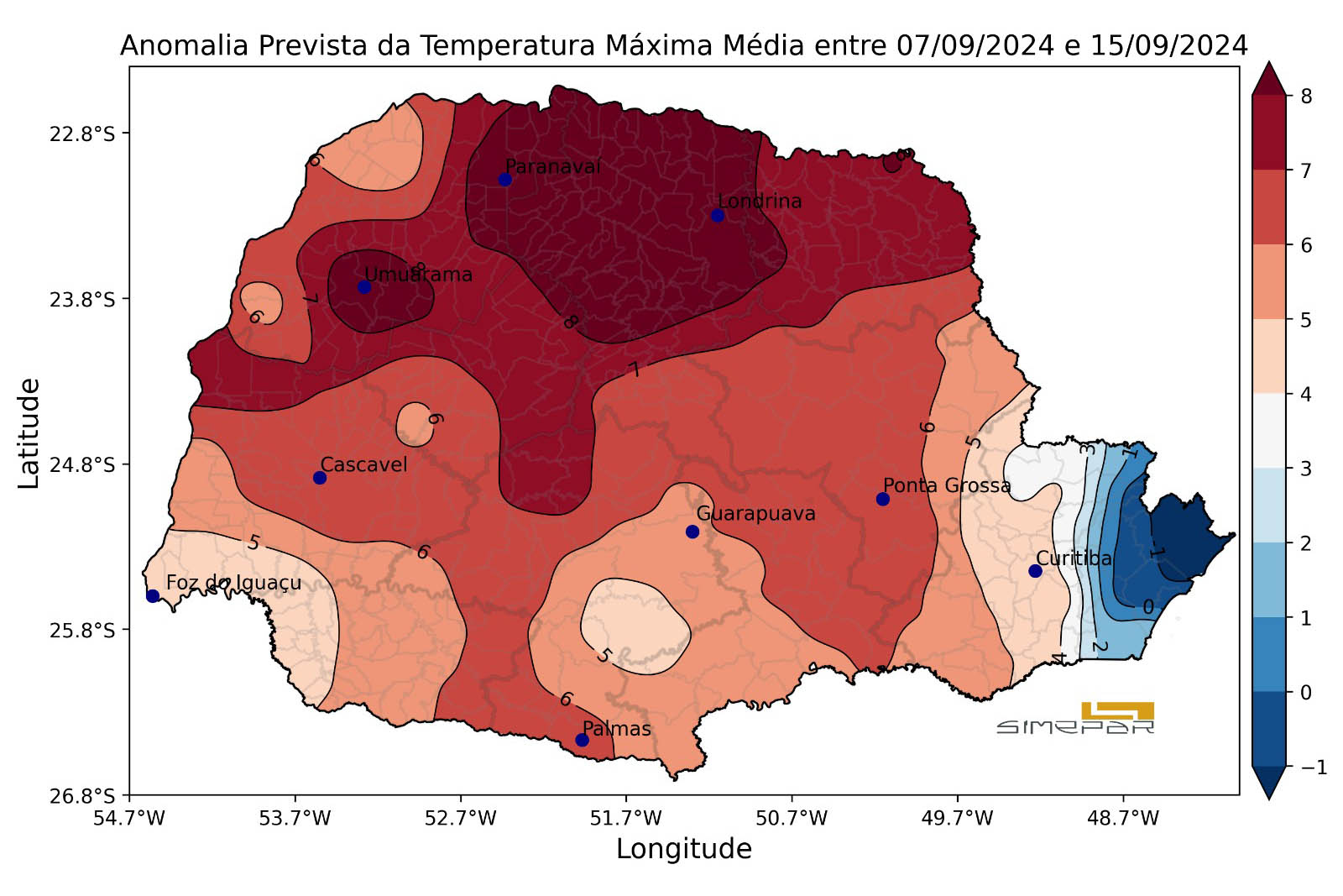 Já a temperatura máxima média deve ser superior a 30ºC em quase todo o Estado. Nas regiões Norte e Noroeste, os termômetros podem registrar uma anomalia de temperatura de até 8º C, que significa que as temperaturas estarão acima das médias históricas para o período.