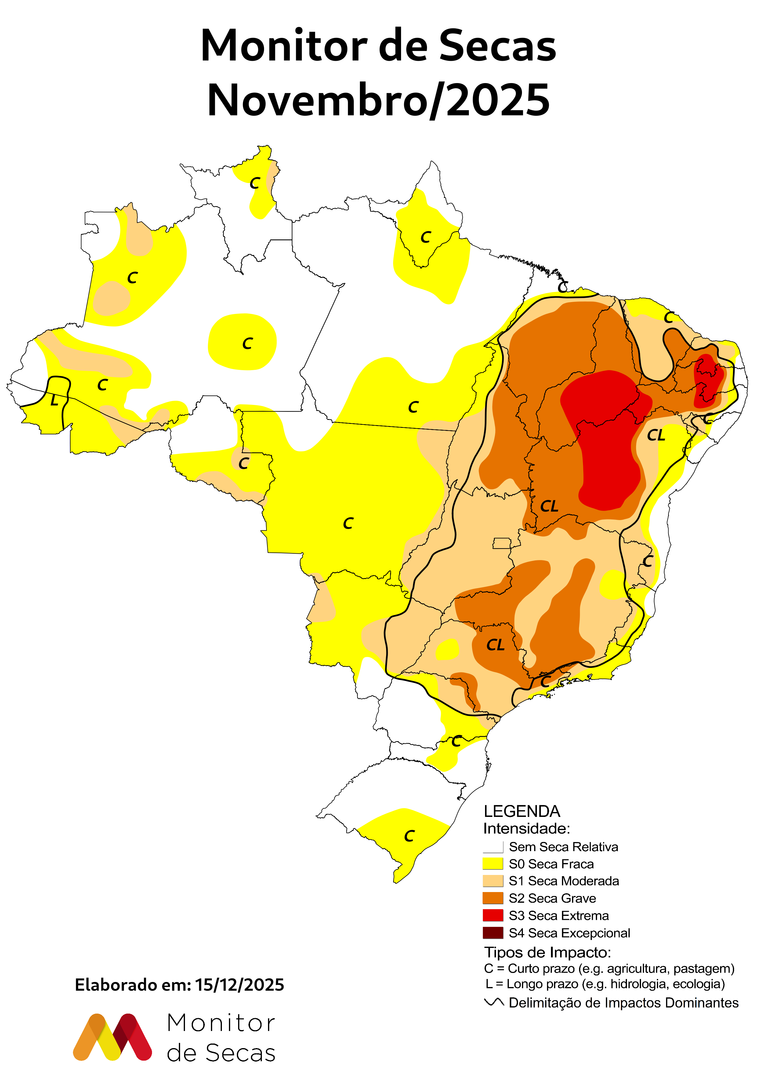 O último relatório do órgão publicado em 15 de dezembro avaliando o mês anterior, novembro, classificou a região naquele momento se encontrava em situação de seca fraca e moderada. Em dezembro o regime de chuvas continuou irregular, registrando chuva abaixo da média histórica em alguns municípios, Antonina, por exemplo, que tem como média no último mês do ano 215.7 mm choveu apenas 60.4mm.