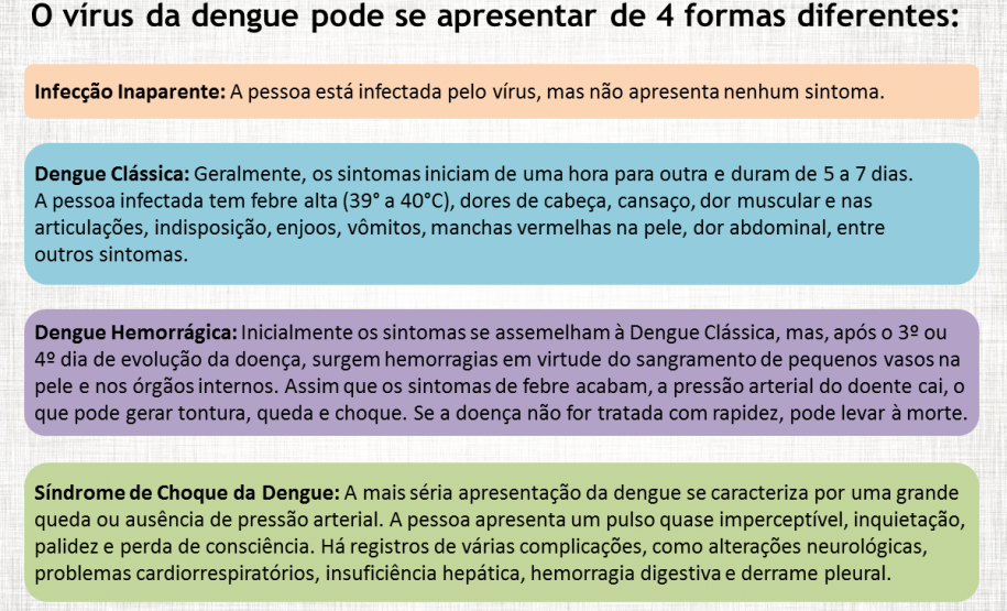 O vírus da dengue pode se apresentar de quatro formas diferentes, que vai desde a forma inaparente, em que não há sintomas, até quadros de hemorragia, que podem levar o doente ao choque e ao óbito.