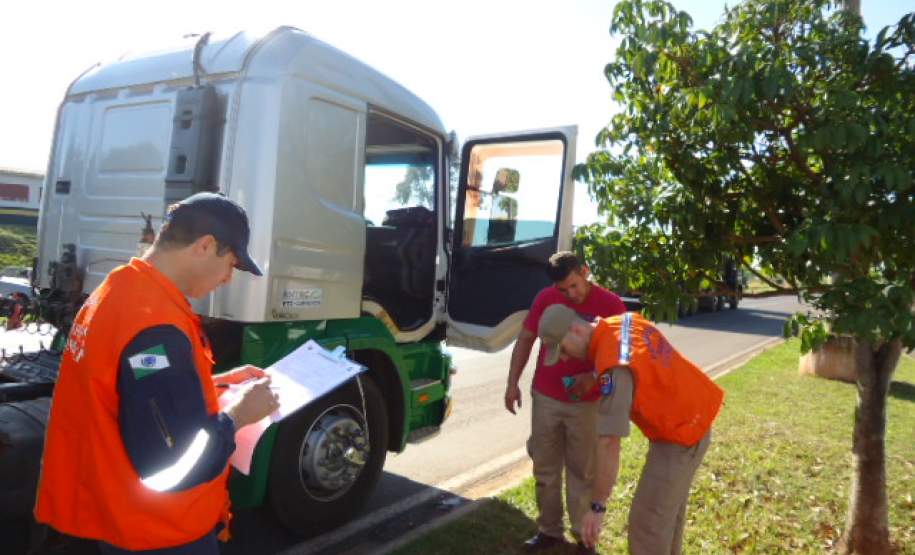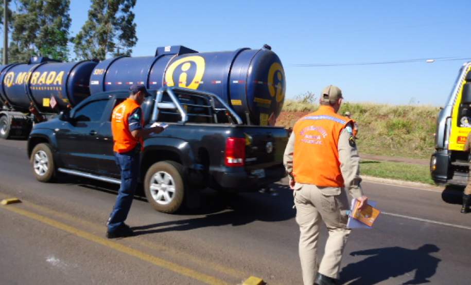 Foram fiscalizados 13 veículos, destes dois veículos estavam irregulares para o transporte de produtos perigosos, e foram notificados pela Polícia Rodoviária Estadual.