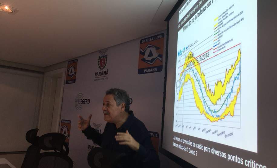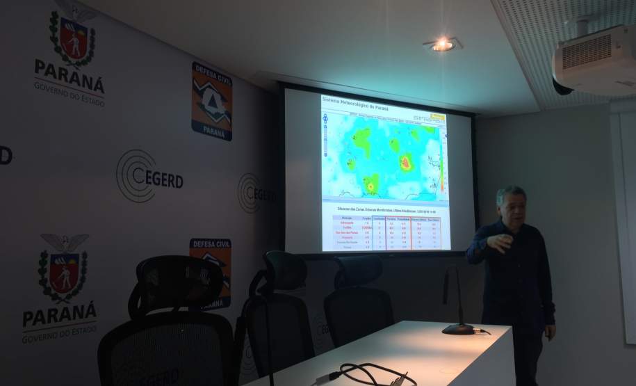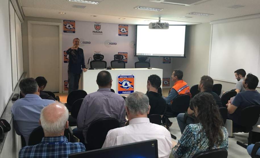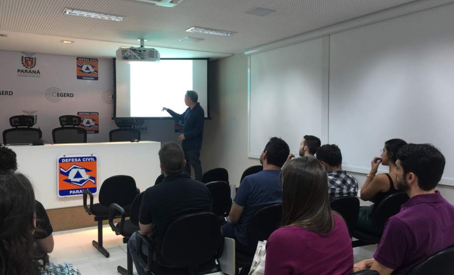 No dia 9 de março, no CEGERD - Centro Estadual de Gerenciamento de Riscos de Desastres localizado no Palácio das Araucárias aconteceu uma palestra ministrada pelo Dr. Eduardo Alvin Leite, Presidente do SIMEPAR – Sistema Meteorológico do Paraná, para membros da Coordenadoria Estadual de Proteção e Defesa Civil (CEPDEC), bolsistas e profissionais do Sistema Paranaense de Informações para a gestão dos Riscos a Desastres Naturais (SIGRisco).