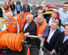 PRESENÇAS – Participaram da entrega dos equipamentos os secretários estaduais João Carlos Ortega (Casa Civil), Hudson Teixeira (Segurança Pública), Santin Roveda (Justiça e Cidadania) e Ulisses Maia (Planejamento); o superintendente-geral de Relações Institucionais da Casa Civil, Renato Adur; o deputado federal Ricardo Barros; os deputados estaduais Batatinha, Evandro Araújo, Gilberto Ribeiro e Moacyr Fadel; o diretor-presidente da Instituto Água e Terra (IAT), Everton Souza, o diretor de Saneamento Ambiental e Recursos Hídricos do IAT, José Luiz Scroccaro; prefeitos de diversas cidades e demais autoridades.