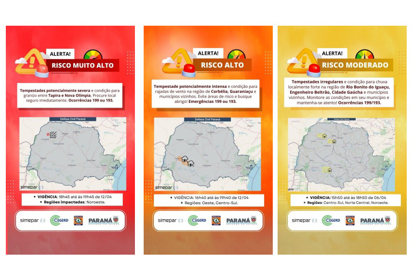 Todos os alertas são elaborados e emitidos por especialistas do Centro de Gerenciamento de Risco e Desastre (Cegerd) com base em dados do Simepar (Sistema de Tecnologia e Monitoramento Ambiental do Paraná) e observações em tempo real, 24 horas por dia.
