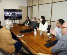 PRESENÇAS – Participaram da reunião gestores da Secretaria de Saúde do Paraná, os diretores das 22 Regionais de Saúde, apoiadores do Conselho de Secretários Municipais de Saúde (Cosems/PR), o presidente da Associação dos Municípios do Paraná (AMP), Júnior Weiller e o diretor executivo do Consórcio Paraná Saúde, Carlos Roberto Kalckmann Setti.